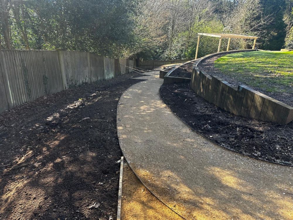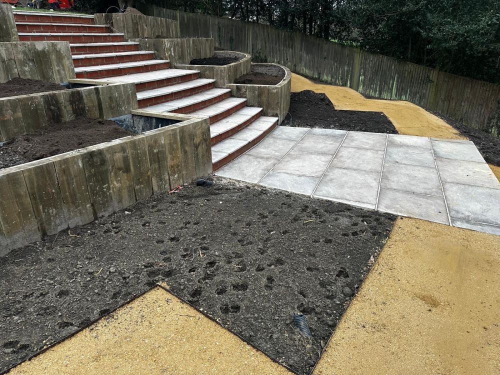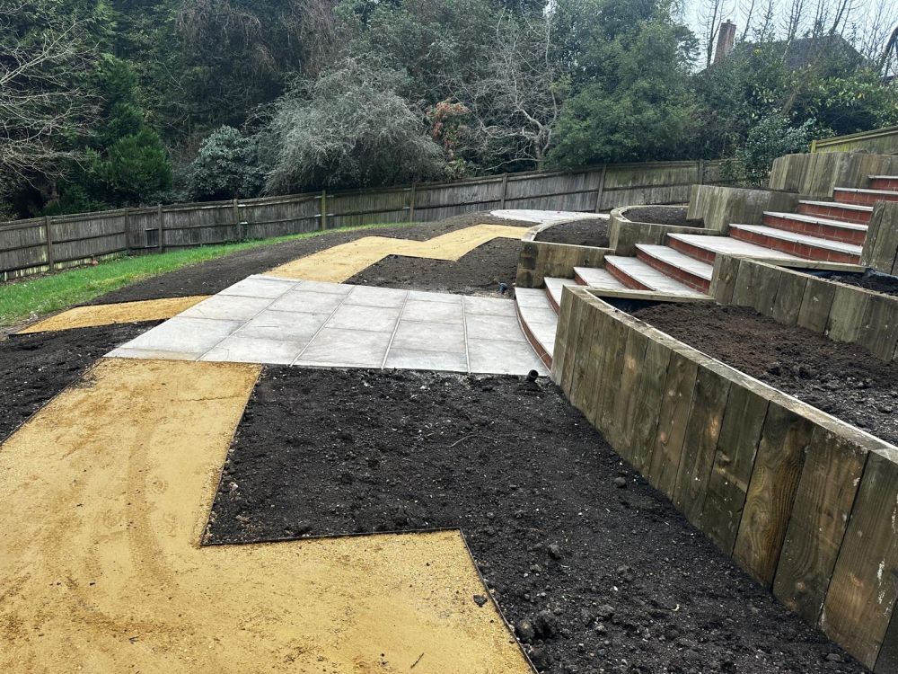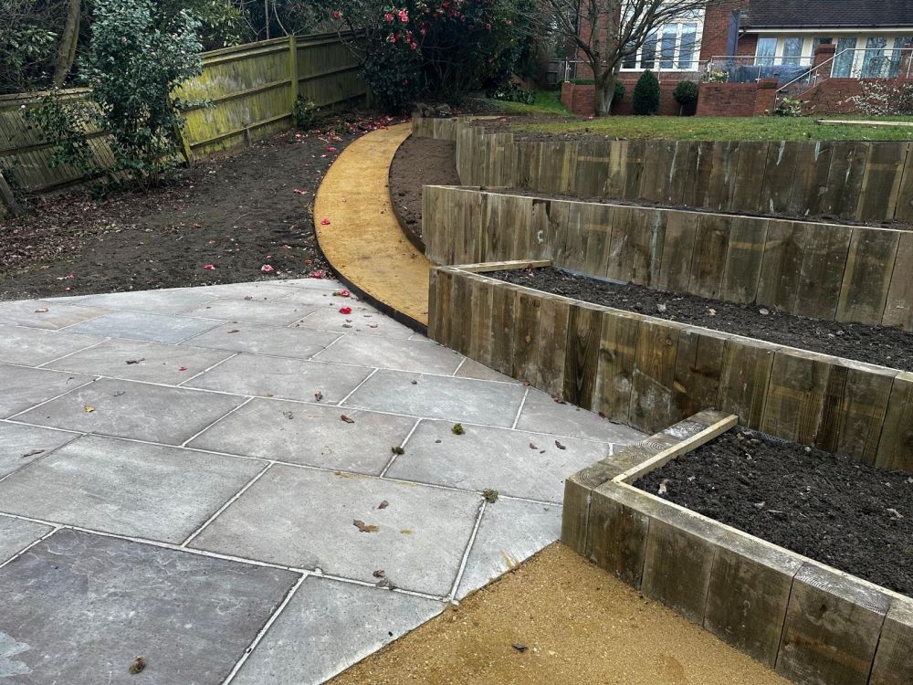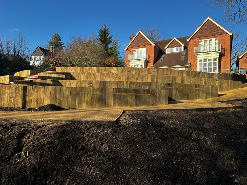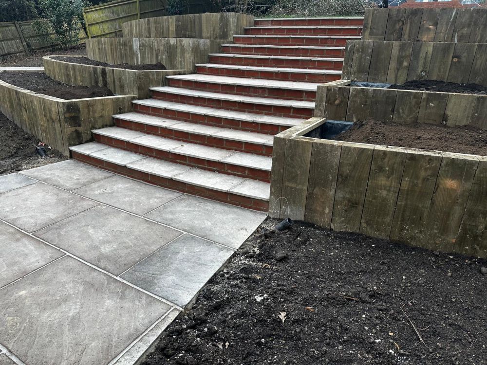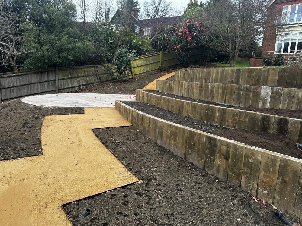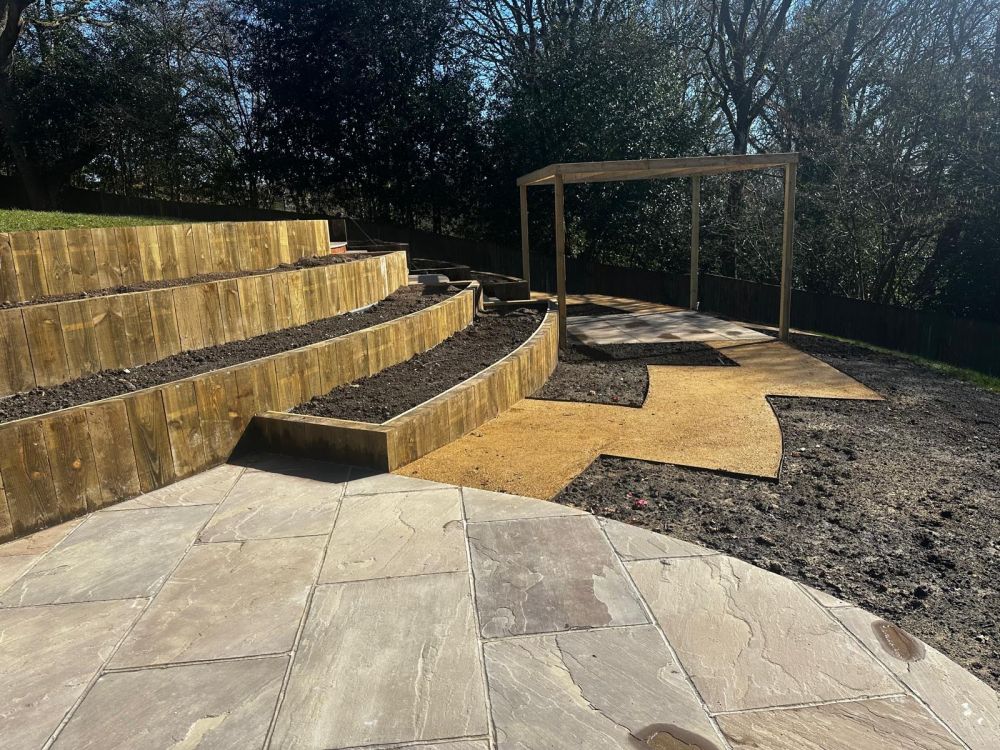 - Multi terraced beds were installed into the slope using softwood treated sleepers laid vertically on top of a concrete footing.