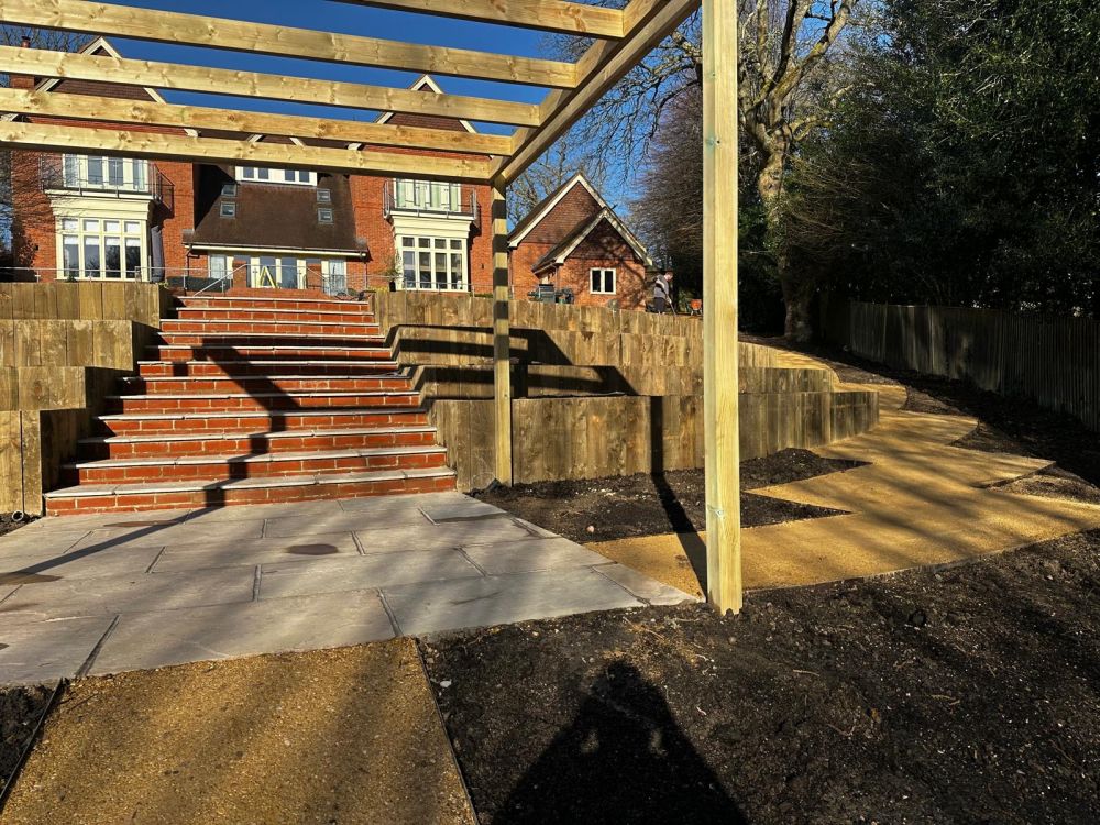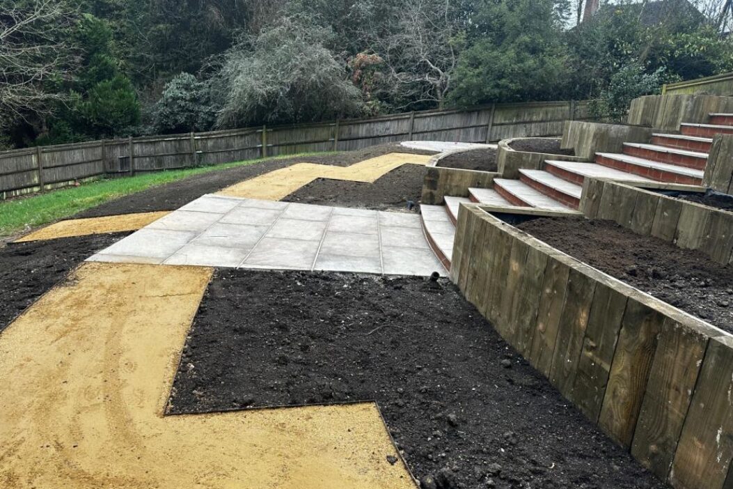 A steeply sloped Cold Ash garden is transformed with terraced beds and a series of wide sweeping steps.